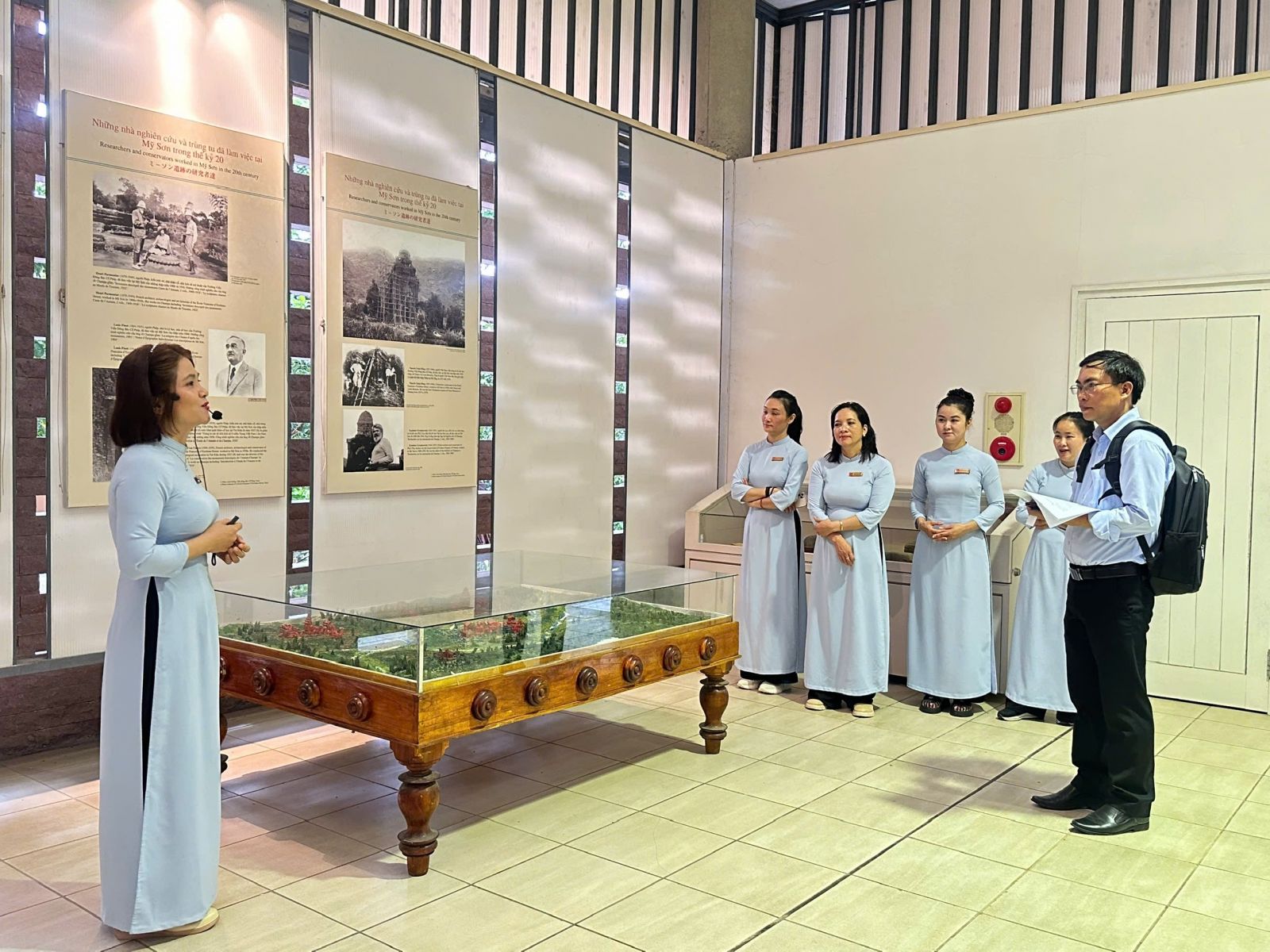 Tham gia chương trình có đại diện lãnh đạo Ban Quản lý, cán bộ Phòng Bảo tồn Bảo tàng, cùng toàn thể đội ngũ thuyết minh viên của Bảo tàng Mỹ Sơn và khu di tích. Đoàn khảo sát trực tiếp dự nghe các phần thuyết minh tại bảo tàng và các nhóm đền tháp, ghi nhận và đánh giá năng lực của từng hướng dẫn viên qua kiến thức chuyên môn, kỹ năng truyền đạt, phong cách trình bày và khả năng tương tác với khách tham quan.