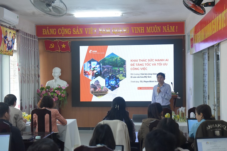 Sáng ngày 27-11, Ban Quản lý Di sản Văn hóa thế giới Mỹ Sơn tổ chức lớp tập huấn chuyển đổi số - ứng dụng công nghệ AI. Tham gia lớp tập huấn có Tiến sỹ Phạm Minh Vương – Chuyên gia cao cấp, Giám đốc công ty DFM (có trụ sở tại thành phố Hồ Chí Minh). Bà Văn Thị Cẩm Tú – Phó Giám đốc Ban, chuyên viên các phòng chuyên môn Ban Quản lý.