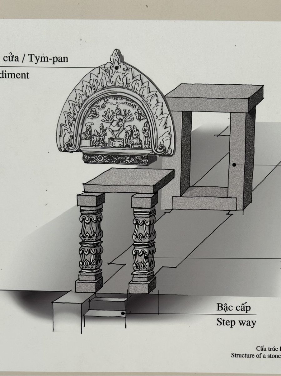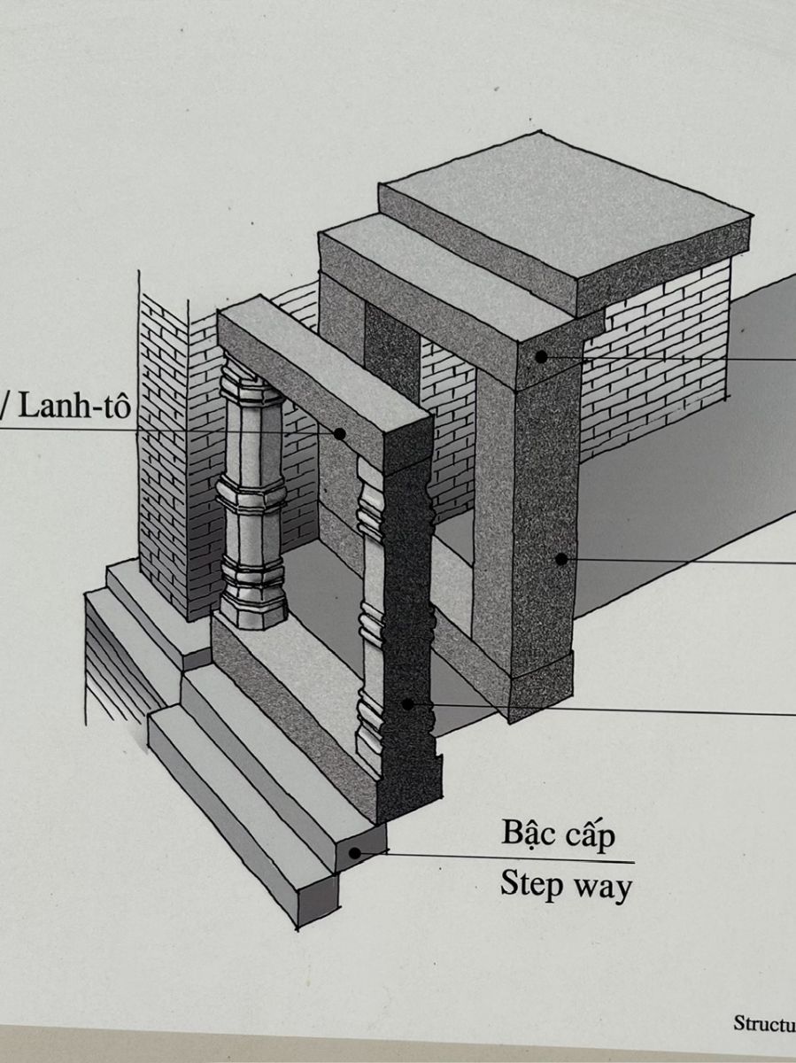 Khối kiến trúc được thu lại nhỏ hơn vật liệu đá không thể thiếu cho cấu trúc tiền sảnh, khung cửa. Cửa vào một ngôi tháp là một tiền sảnh ngắn bao gồm hai khung đá bên trong và bên ngoài, (cá biệt một vài công trình có thay đổi khung bên ngoài là trụ xây bằng gạch). Kỹ thuật chế tác khung đá được tính toán kỹ lưỡng, khối đá đà cửa (khối dưới) khi nào kích thước lớn hơn khối đá lanh-tô (khối trên), hai trụ thoạt nhìn là hình trụ vuông nhưng thực ra chân trụ lúc nào cũng to hơn đầu trụ, bề mặt ngoài thân trụ phẳng nhẵn nhưng phía trong tiếp xúc với tường gạch được tạo gờ hoặc thô nhám mục đích tăng độ bám dính với tường gạch. Trên lanh-tô chúng ta thường thấy có tấm tympan hình tam giác thường điêu khắc các vị thần. Ngoài ý nghĩa nội dung bức điêu khắc nhấn mạnh hình ảnh thờ vị thần bên trong đền, tăng thêm điểm nhấn thẩm mỹ kiến trúc còn là công năng quan trọng chia phần chịu lực cho tấm lanh-tô (trọng lực khối kiến trúc bên trên được phân đều ra hai đầu trụ, tránh trọng lực rơi vào trung điểm lanh-tô) (hình 1). Thân tháp có nhiều trụ áp tường, vòm cửa chính, vòm cửa giả (nhiều gờ góc) mục đích vừa trang trí vừa tăng cường lực cho khối kiến trúc.